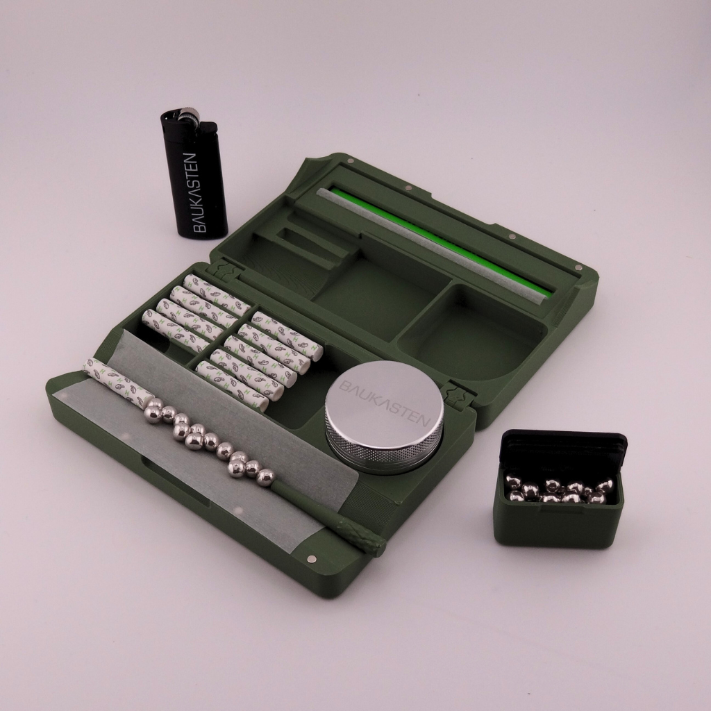 Klein aber oho. Alles drin was du zum Bauen brauchst: Bauunterlage, Mischeschale, Filter Batterie, Pape Spender, Feuer & Stopfer.