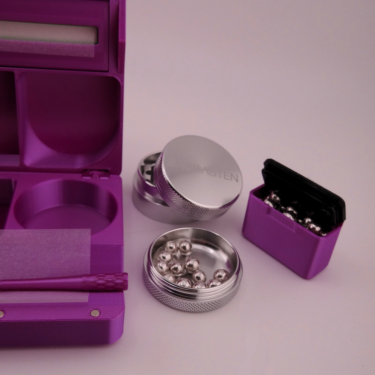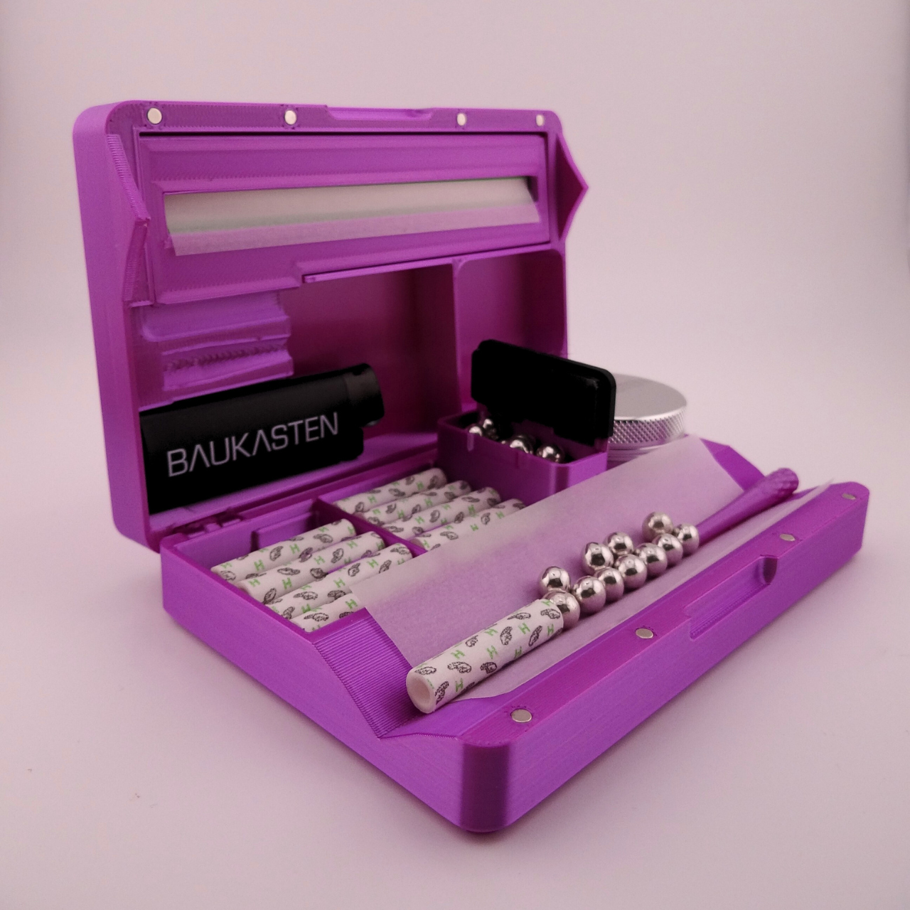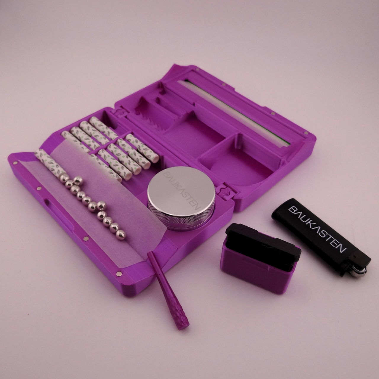Small but mighty. Everything you need for rolling is included: rolling base, mixing area, filter battery, paper dispenser, lighter & tamper.