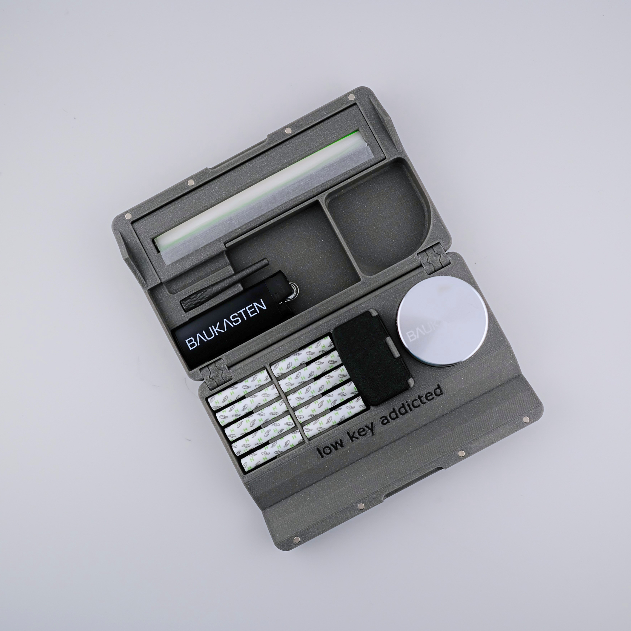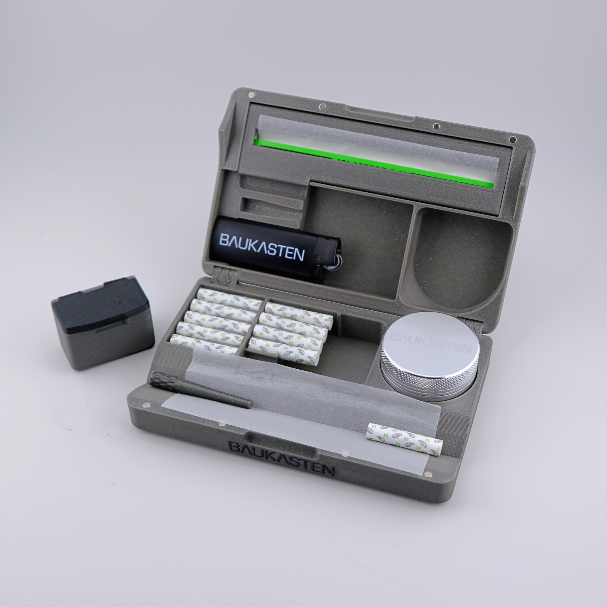 Klein aber oho. Alles drin was du zum Bauen brauchst: Bauunterlage, Mischeschale, Filter Batterie, Pape Spender, Feuer & Stopfer.